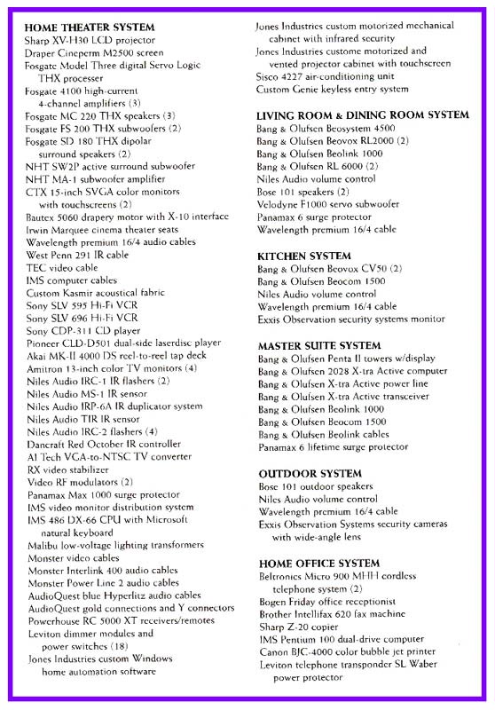 headphones throughout with individual control Share High Speed DSL Internet, files, software, printers, fax, scanner, server, etc. on all computers Multi-room distribution of your video (e.g. share satellite, DVD, VCR, etc.) throughout your home from the main area- so you don't waste money duplicating components, interconnects, etc. that clutter up your rooms Create your own in-house television channels for easy viewing of any or all shared components throughout the house Security cameras viewed from any television, talk with the person at the front door or gate over the phone and let them in by pushing a button on the phone Dedicated theaters with stationary or drop-down screens and projectors Integrated control of lighting, audio and video, drapes or blinds, gas logs, heat and air-conditioning, cameras, popcorn machine you name it. See Integrated Systems Installation, Audio/Video systems, Home Automation, Computers, Networking, Telephone Systems and Commercial Installation for more information. |